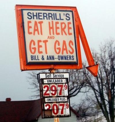 Picture of a sign for a gas station and restaurant cross promoting with hilarious results.