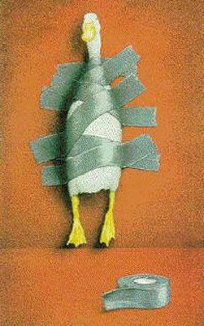 Picture portraying a scene of duck tape, in which a duck is taped to the wall using duct tape.