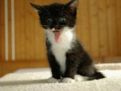 Picture of an adorable little kitten sitting there with a truly crazed look in his eyes.