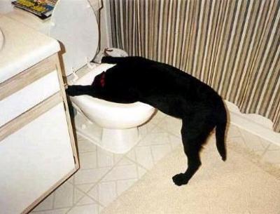 Picture of a cat leaning over the toilet just like someone who stumbled in drunk and sick.