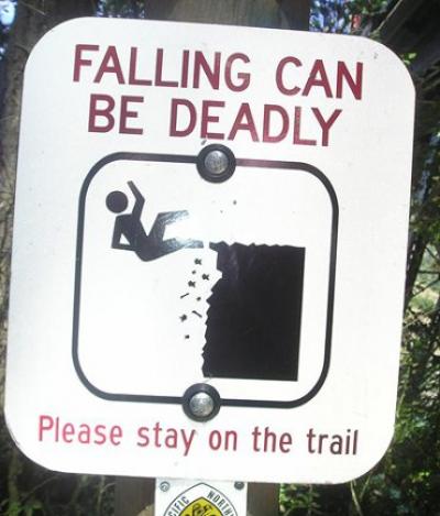 Picture of a warning side to the side of a hiking trail telling people that falling can be deadly.