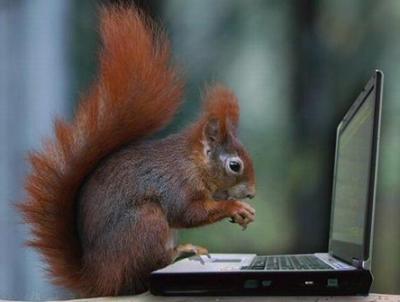 Picture of a goofy-looking squirrel crouched over a notebook computer as if typing on the keyboard.