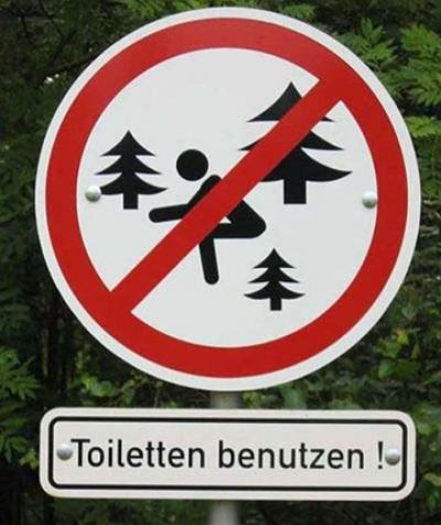 Picture of a strange sign warning people not to go to the bathroom out in the wooded area.