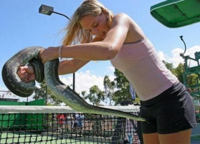 Picture of tennis player Nicole Vaidisova holding a large snake that really seems to like her a lot.