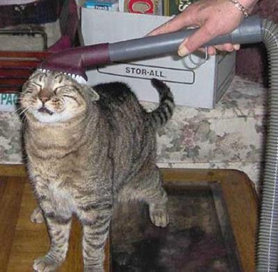 Cute picture of a cat with its head being sucked on by the hose from a vacuum cleaner extension.