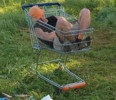 Picture of a guy who has managed to fall asleep cramming his body inside of a shopping cart.