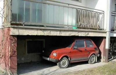 Picture of a ridiculously small car parked in a covered space that only it could fit in.