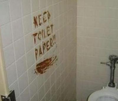 Picture of an empty toilet stall that appears to have been running low on fresh toilet paper.