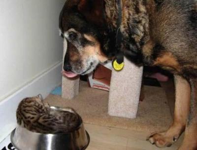 Picture of a cat curled up inside of a dog dish taking a nap while the dog looks a bit confused.