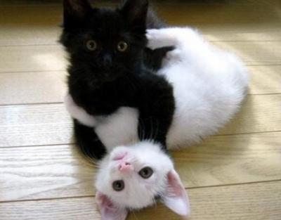 Picture of two cats lying down together and are looking up like two lovers who were interrupted.