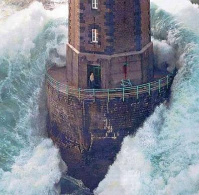 Picture of an insanely huge wave crashing down around a lighthouse and some guy standing there.
