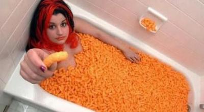 Picture of a girl who is soaking in a bathtub filled entirely with cheese puffs instead of water.