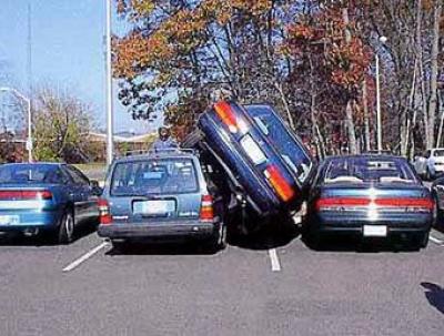 Picture of a car that ended up wedged right between two other cars next to each other in a parking lot.