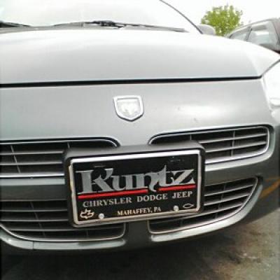 Picture of a dealership license plate on a new car promoting Kuntz Chrysler, Dodge and Jeep.
