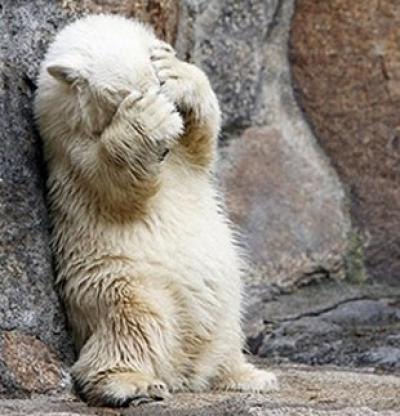 Picture of a polar bear cub covering his face the same way a celebrity does to avoid a photograph.