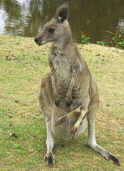Picture of a mother kangaroo and a joey jumped into her pouch head first and seems to be stuck.