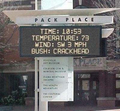 Picture of a sign featuring updates on the temperature, time, wind and George W. Bush.