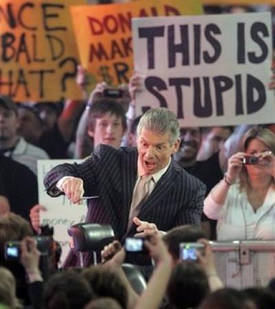 Picture of Vince McMahon in the middle of a publicity stunt when someone calls him out with a sign.