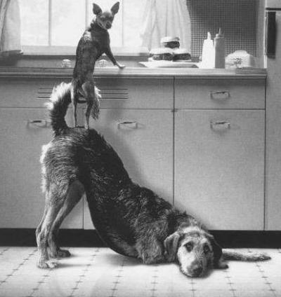 Picture of two dogs who work together to get to some hamburgers sitting on the kitchen counter.