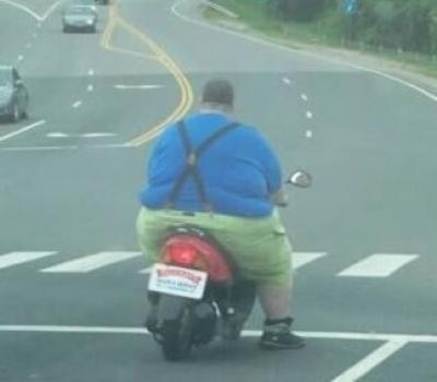 Picture of a hugely obese man sitting on top of a little scooter that must be close to buckling.