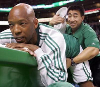 Goofy picture of NBA star Sam Cassell being stretched out before the game by a team trainer.