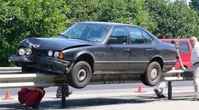 Picture of a car that went off the road and somehow ended up suspended on top of the guard rail.