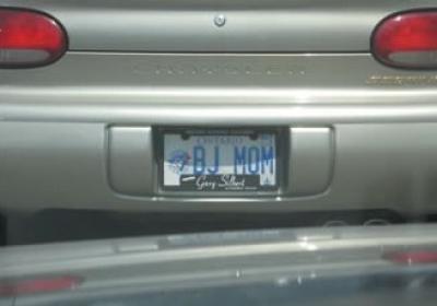 Picture of a personalized license plate that reads BJ Mom, which is either oblivious or weird.