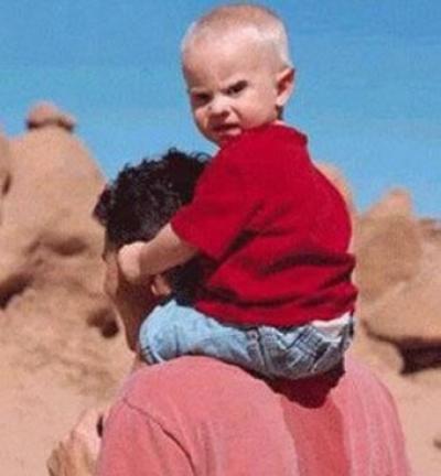 Picture of a dad carrying his baby son on his shoulders and the kid peed down his neck and back.